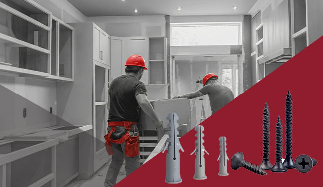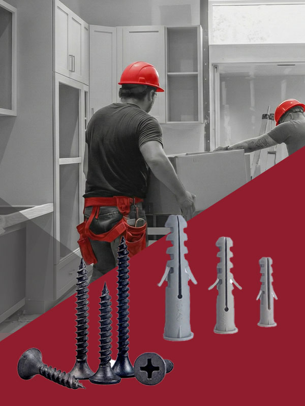 Solution: Drywall screws and plastic plugs for professional furniture assembly and interior finishing.
